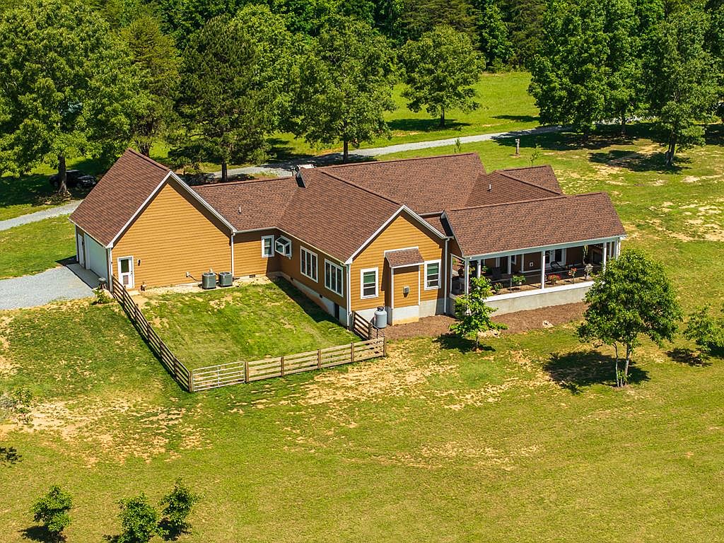 This aerial perspective reveals a spacious, single-story home set amid a large, open grassy area with several mature trees. The house features a warm, mustard-yellow siding complemented by a rich brown shingle roof, evoking a cozy countryside aesthetic. Architectural elements include multiple gables and a wraparound covered porch adorned with comfortable seating, providing inviting outdoor living space. A fenced yard section sits adjacent to the building, indicating an area possibly designated for pets or gardening. The driveway leads to a garage, and the property blends rustic charm with functional modernity within a tranquil natural setting.