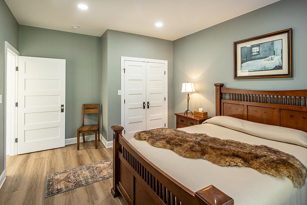 This bedroom blends classic craftsmanship with cozy elements. The dominant piece is a sturdy wooden bed frame with clean lines and a paneled headboard that showcases rich wood tones. A soft beige bedding set is complemented by a deep brown faux fur runner, adding warmth and texture. Walls painted in a muted sage green create a calm atmosphere, paired with white five-panel doors that add subtle architectural interest. A wooden nightstand with a traditional lamp casts a gentle light, while a simple wooden chair occupies a corner next to a runner-style rug with intricate, muted patterns, enhancing the room’s inviting charm.
