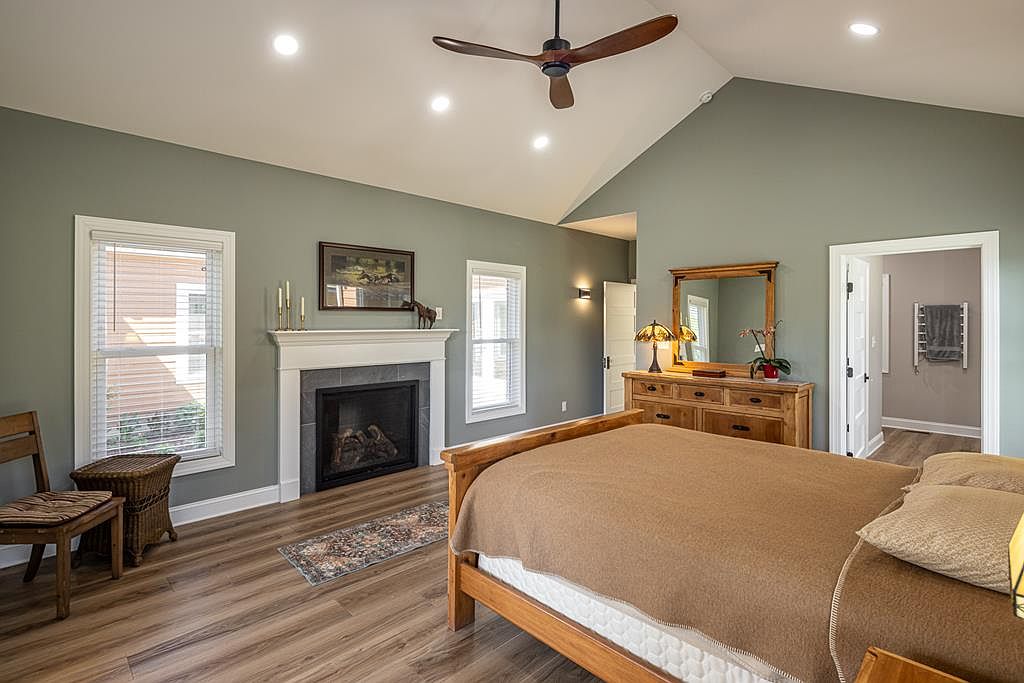 This master bedroom features a calming muted green wall color paired with warm wood tones in the flooring and furniture, creating a cozy yet sophisticated ambiance. The vaulted ceiling enhances the room’s spaciousness, complemented by recessed lighting and a modern wooden ceiling fan. An elegant white fireplace with a dark hearth is flanked by twin windows with white blinds, inviting natural light. The wooden bed, dresser with matching mirror, and small woven chair add rustic charm. A small oriental-style runner rug and tasteful decor elements highlight the room’s inviting and balanced design.