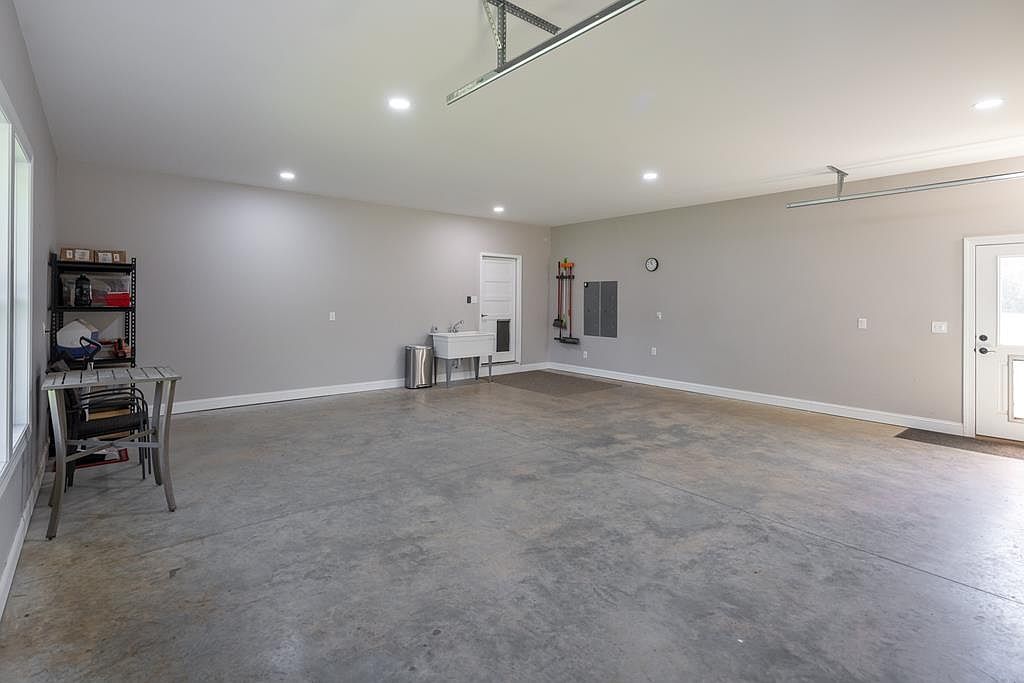 This spacious garage features a polished concrete floor extending across the large open area, ideal for multiple vehicles or workspace. Soft, neutral light gray walls complement the ceiling equipped with recessed lighting, creating a bright and functional atmosphere. To the left, a small metal shelving unit and a table offer practical storage and workspace. The back wall includes a utility sink and trash can nearby, with an exterior door providing an additional entry point. A clean, minimalist design promotes versatility, while elements like the mounted broom rack and electrical panel emphasize this as an organized, utilitarian space.