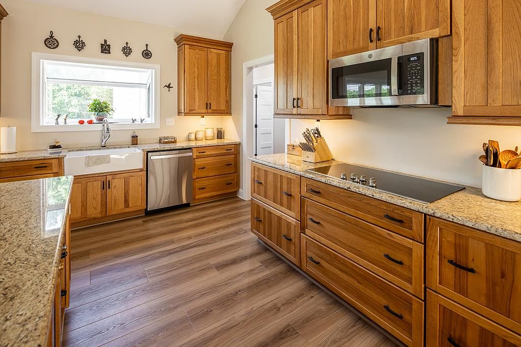 This kitchen features a spacious U-shaped layout with warm oak cabinetry creating a cozy yet functional workspace. Light granite countertops contrast beautifully against the natural wood tones, enhancing the rustic charm. A stainless steel dishwasher sits beneath the window, which floods the space with natural light while offering a pleasant view. The built-in microwave above the sleek electric cooktop maintains clean lines and modern convenience. The floors are a wood-look laminate, complementing the cabinetry and adding visual warmth. Minimalistic black hardware and subtle decorative wall hangings add character without overpowering the clean, inviting aesthetic.