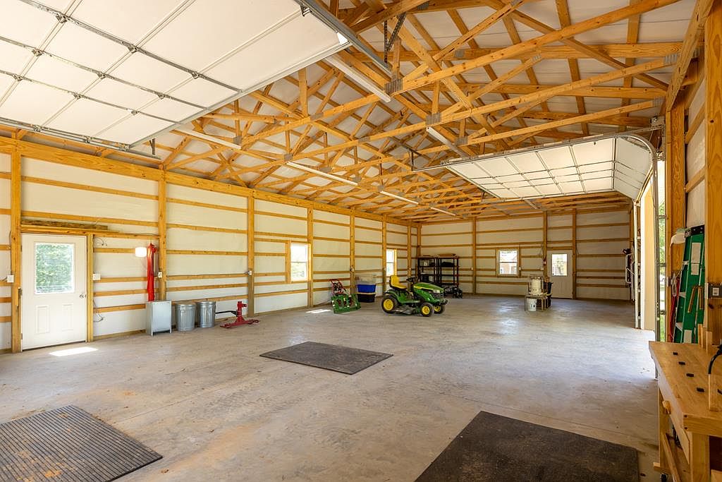 This expansive garage features an open layout with high ceilings supported by exposed wooden trusses, creating a rustic yet functional atmosphere. The walls combine natural wood framing with light cream paneling, contributing to a bright and airy feel. Large roll-up garage doors on either end allow for ample natural light and easy vehicle access. The concrete floor maintains a practical, durable surface, complemented by a few rubber mats to provide traction and protection. Basic utility items and some equipment, including a green riding lawn mower and a shelving unit, are neatly positioned along the walls, emphasizing the space’s multi-purpose utility.