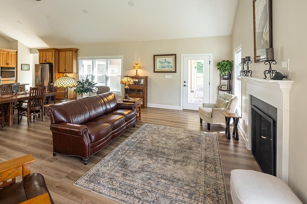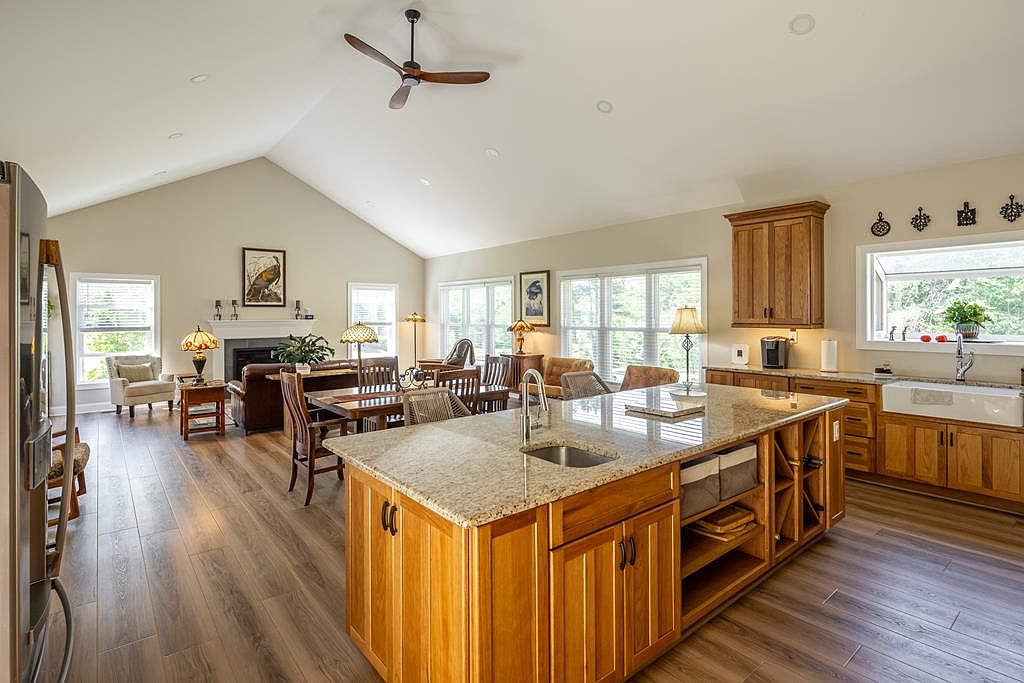 This spacious open-concept area combines a kitchen, dining, and living room with vaulted ceilings enhancing the airy feel. Warm wood tones define the cabinetry and flooring, creating a cozy, natural ambiance. A large granite island with built-in shelves supports food prep and casual dining, while the farmhouse sink under a wide window offers charming views outside. The seating includes a wooden dining set and a comfortable living space centered around a classic white fireplace. Light walls and ample windows foster brightness, balanced by tasteful vintage-style lamps and recessed ceiling lights, blending modern convenience with rustic warmth.