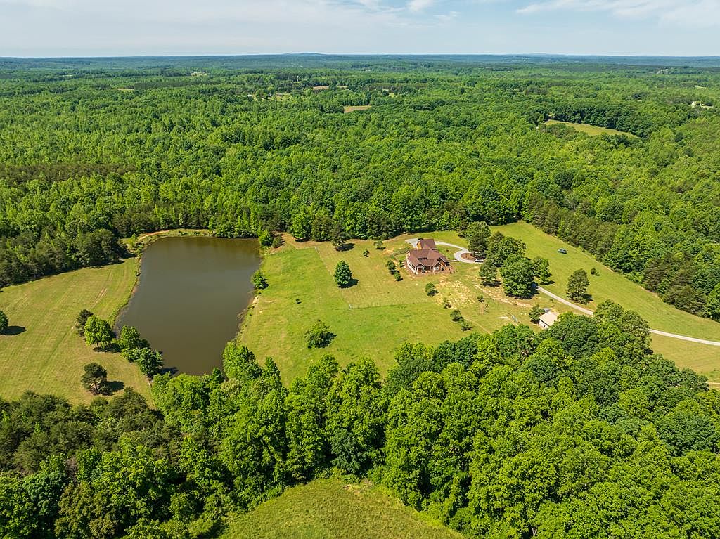 This expansive aerial view highlights a rural estate set amid lush greenery and dense forest. The home is centrally located on a spacious, well-manicured lawn, surrounded by mature trees that provide privacy and a natural aesthetic. A sizable pond is situated nearby, adding a tranquil water element that complements the pastoral landscape. A curved driveway leads to the house and a detached garage or outbuilding, emphasizing both functionality and charm. The overall design showcases seclusion, natural beauty, and open space, making it ideal for those seeking a peaceful country living experience.