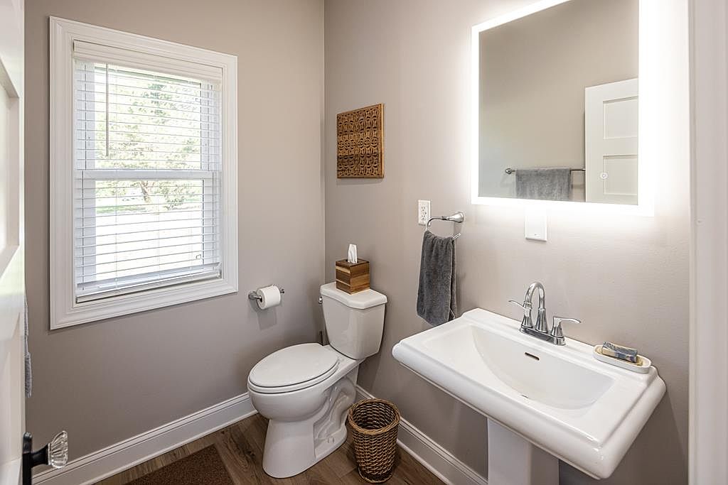 This compact powder room features a bright, airy atmosphere with its soft beige walls complemented by white trim and fixtures. The flooring is a warm-toned wood-like material that adds an inviting, natural texture. The white pedestal sink with sleek, modern chrome faucets is paired with a large, illuminated mirror that enhances the room’s brightness and provides functional lighting. A white toilet is positioned beside a window adorned with white blinds, allowing for natural light and privacy. Subtle decorative touches include a woven wicker wastebasket, a wooden tissue box holder, and a small carved wooden wall piece, creating a balanced blend of modern and rustic charm.