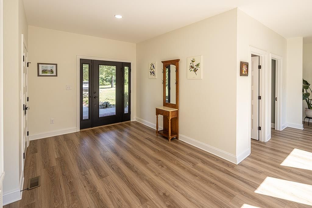 This welcoming entryway features a warm wood-look floor with wide planks that add natural texture and depth to the space. Soft cream walls create a bright, airy backdrop highlighting classic white trim and baseboards. A striking black-framed glass double door serves as the focal point, bringing in abundant natural light and views of the lush exterior lawn. Minimal yet charming décor includes a vintage wooden hall tree with mirror and small seat, alongside two botanical prints for a touch of nature-inspired elegance. The overall layout is open and inviting, leading into additional rooms with white door frames visible on the right.