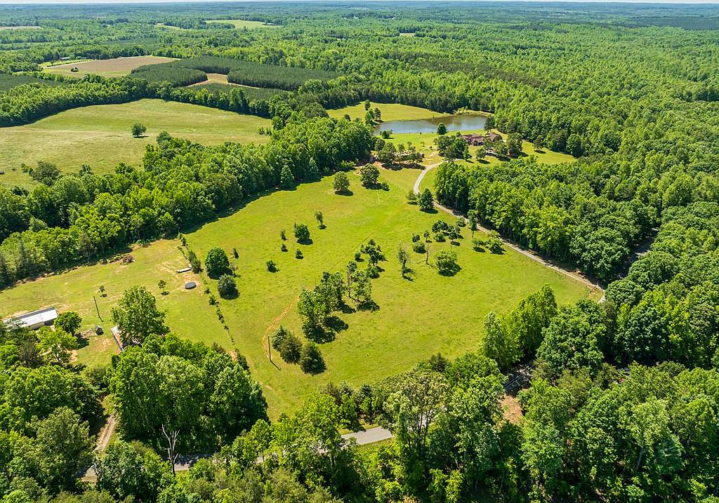 This vast rural property offers a serene and picturesque landscape extending as far as the eye can see. Rolling green fields dotted with trees create a peaceful, pastoral setting, bordered by dense woods for privacy and natural beauty. A winding driveway leads to a charming main residence nestled near a reflective pond, adding an element of tranquility. The expansive acreage suggests ample opportunity for outdoor activities, gardening, or livestock. This elevated view showcases the harmonious blend of manicured open land with untouched forest, creating a perfect balance of cultivated and wild aesthetics that enhance country living appeal.
