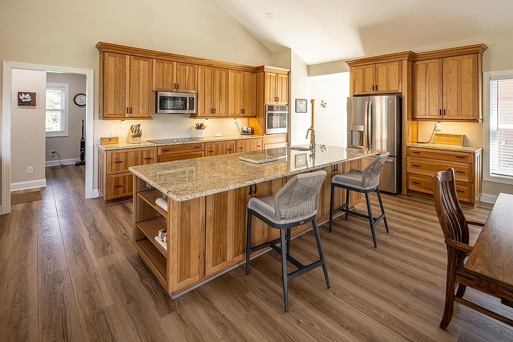 This kitchen features a central island topped with polished granite, offering both workspace and casual seating with two modern barstools. Surrounding cabinetry crafted from warm-toned wood creates a welcoming, natural ambiance and provides ample storage. Stainless steel appliances complement the wood’s earthy hues, reflecting light in this bright, airy space. The room’s layout prioritizes flow, with a walkway connecting to adjacent rooms for convenience. Natural light streams in through blinds beside the fridge, highlighting the wood-grain vinyl flooring that enhances the kitchen’s cohesive aesthetic. The space balances functionality with a warm, inviting style.