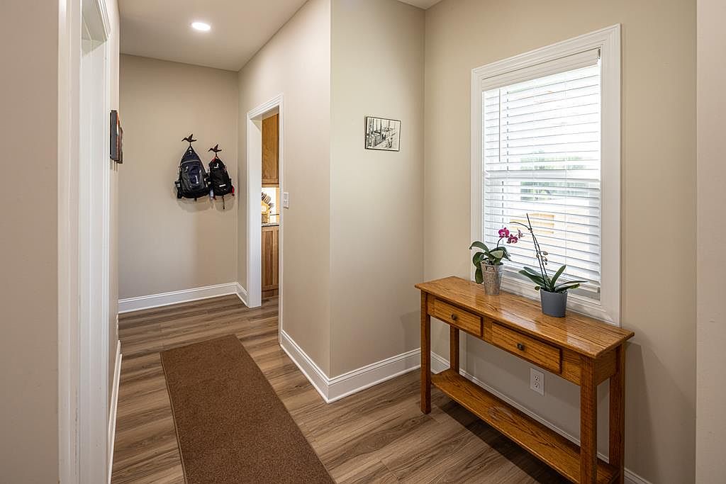 This entry hallway features a warm, neutral palette with soft beige walls contrasting against rich wood-look flooring that adds both warmth and texture. A simple wooden console table with three drawers stands beneath a window with white blinds, adorned by two small potted orchids that introduce a touch of nature and subtle color. Hooks mounted on the far wall hold backpacks, adding practical storage without clutter. Clean white trim and door frames highlight architectural details, while a long brown runner rug guides visitors through the space, blending functionality with understated elegance.