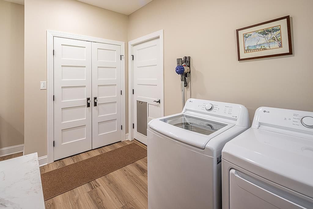 This laundry room showcases a clean, functional layout with modern design touches. The space features light beige walls paired with white five-panel doors, creating a bright and airy atmosphere. The wood-look flooring adds warmth and texture, offset by a simple brown runner rug that leads to the double doors and an adjacent single door, which includes a pet door built into its lower section. White LG washer and dryer units sit side by side, maintaining a sleek and uniform appearance. Mounted on the wall above is a Dyson cordless vacuum, and a framed artwork adds a subtle decorative touch.