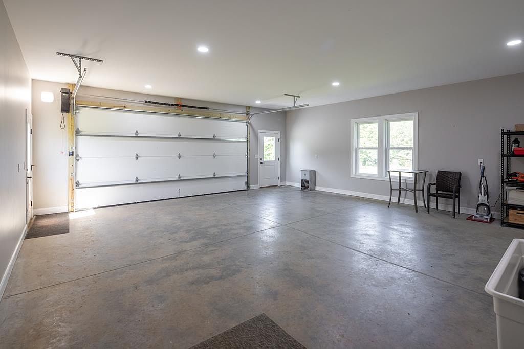 This spacious garage features a clean and understated design with a polished concrete floor that adds a durable, industrial touch. The walls are painted in a soft, light gray, creating a neutral and calming atmosphere. An automatic white garage door spans one wall, accompanied by a side entry door allowing easy access to the outdoors. Recessed ceiling lights provide bright, even illumination throughout the space. A pair of windows to the right bring in natural light, accentuating the simplicity of the room. Minimal furnishings—a small glass table with a chair and a storage shelf—suggest practical utility while keeping the area uncluttered and open.