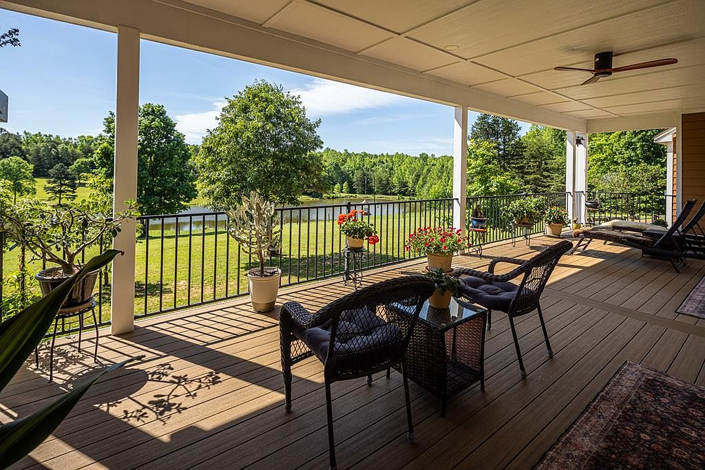 This inviting covered porch offers a serene outdoor retreat with a view of lush greenery and a tranquil pond. The space features warm wood-tone flooring contrasted with white ceiling panels and supporting columns, creating a balanced and comfortable atmosphere. Black wicker chairs with plush dark cushions surround a small glass-topped table, perfect for relaxation or casual conversation. The railing provides unobstructed views while safety remains a priority. Numerous potted plants and vibrant flowers add natural color and charm along the perimeter. A ceiling fan overhead promises comfort on warmer days, completing this peaceful outdoor living area.