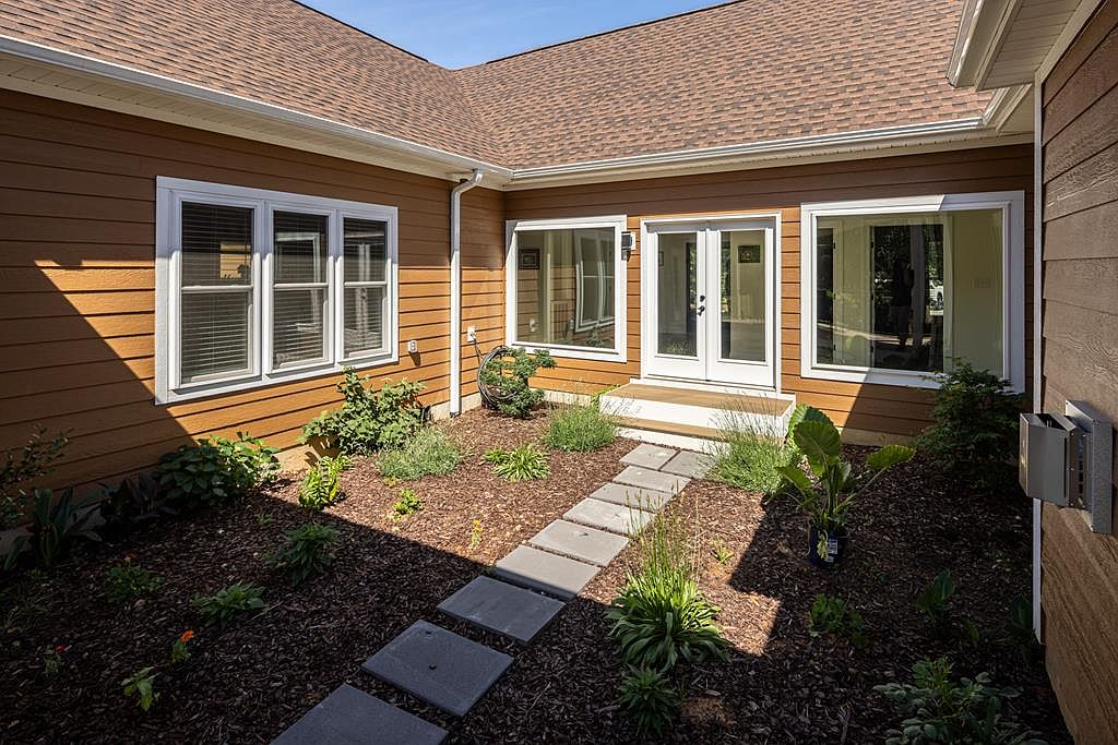 This charming courtyard offers a private, serene outdoor space framed by warm, wooden siding painted in a rich brown. White-framed triple windows and glass French doors provide ample natural light while creating an open connection between indoors and outdoors. A neat stepping stone path leads from one end of the garden to the French doors, guiding visitors through mulch-covered grounds dotted with green foliage and a variety of plants in different sizes and textures. The simple landscaping is well-maintained and lends a peaceful atmosphere, perfect for quiet relaxation or casual outdoor gatherings. The roofline and gutters complete the neat, tidy architectural aesthetic.