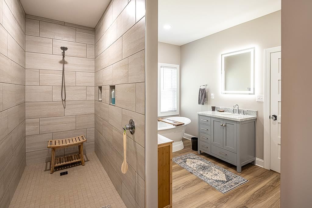 This bathroom section features an open, walk-in shower with large rectangular beige tiles arranged horizontally, creating a sleek, modern look. A simple wooden bench inside the shower adds warmth and functionality. Adjacent to the shower is a stylish vanity area finished in soft gray with a marble countertop. Above the vanity is a backlit mirror offering soft, ambient lighting. The room is completed with wood-look flooring that complements the neutral beige walls and the area rug introduces subtle pattern and texture. A clawfoot tub is visible by a white-framed window, enhancing the elegant yet cozy feel.