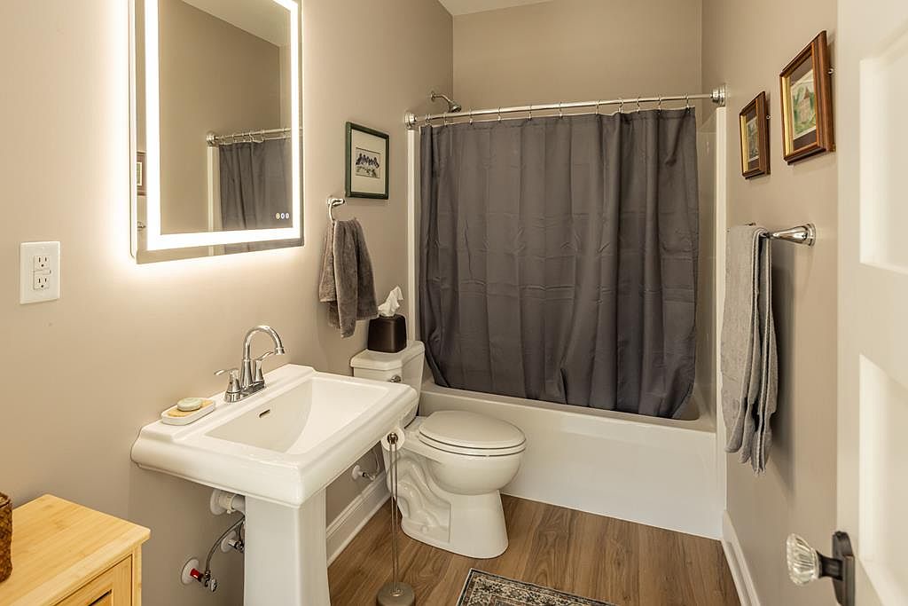 This bathroom features a clean, modern layout combining functionality with subtle elegance. The white pedestal sink stands out against soft beige walls, complemented by a rectangular backlit mirror that provides even, ambient lighting. The white toilet is positioned neatly beside a bathtub, which is concealed by a dark gray shower curtain adding a contemporary contrast. Wooden flooring brings warmth and a natural touch to the space. Small framed artwork and towels in muted tones add modest decorative flair without overwhelming the calm and neutral color scheme, creating a balanced and inviting atmosphere.