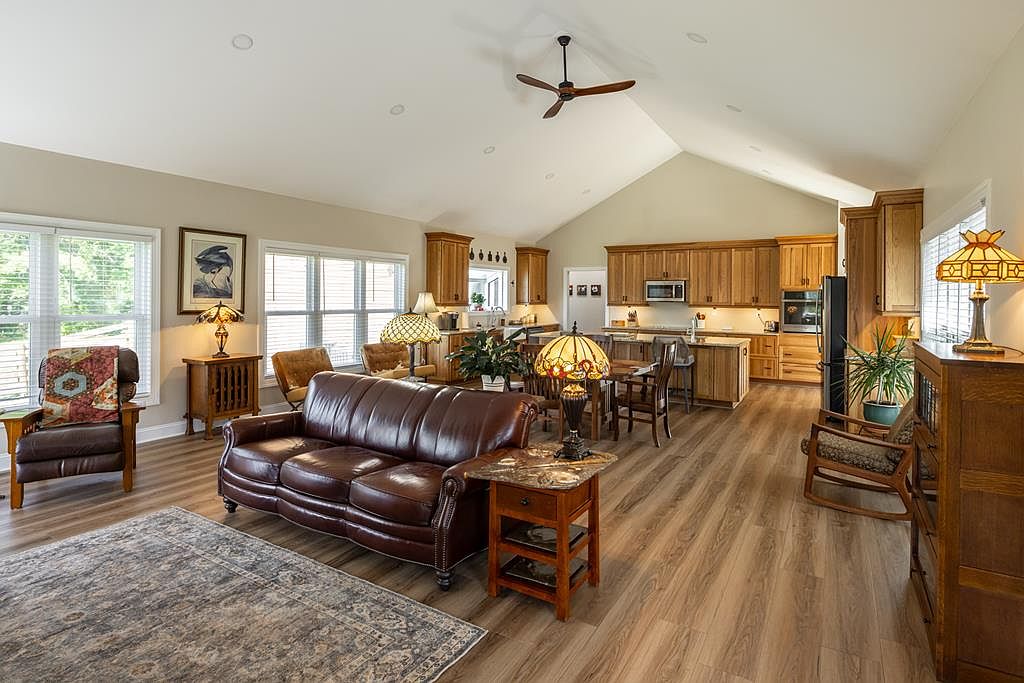 This expansive open-concept space combines the living room and kitchen seamlessly under a vaulted ceiling. Natural light floods in through large multi-pane windows that brighten the neutral walls and wood flooring. The living area features a rich brown leather sofa, flanked by vintage-style wooden side tables topped with stained glass lamps, contributing a classic and warm ambiance. Adjacent seating includes a cozy armchair with a colorful quilt draped over it. The kitchen boasts honey-toned wooden cabinetry, stainless steel appliances, and a small island, maintaining a warm, inviting, and timeless farmhouse aesthetic throughout the space.