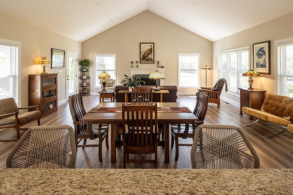 This spacious open-concept living and dining area features a vaulted ceiling painted in soft white, enhancing the natural light streaming through multiple windows along two walls. The walls are painted in a warm beige tone that complements the wood flooring’s subtle grains. A wooden dining table with matching chairs anchors the center, adorned with a simple runner. The seating area includes a mix of vintage-inspired armchairs, a tufted loveseat, and classic wooden side tables topped with stained glass lamps, adding a touch of Craftsman and eclectic charm. The focal point is a white fireplace centered on the far wall, flanked symmetrically by windows, framed with tasteful artwork above the mantel, creating an inviting and harmonious atmosphere. The overall design balances comfort and style with earthy tones and artisanal details.