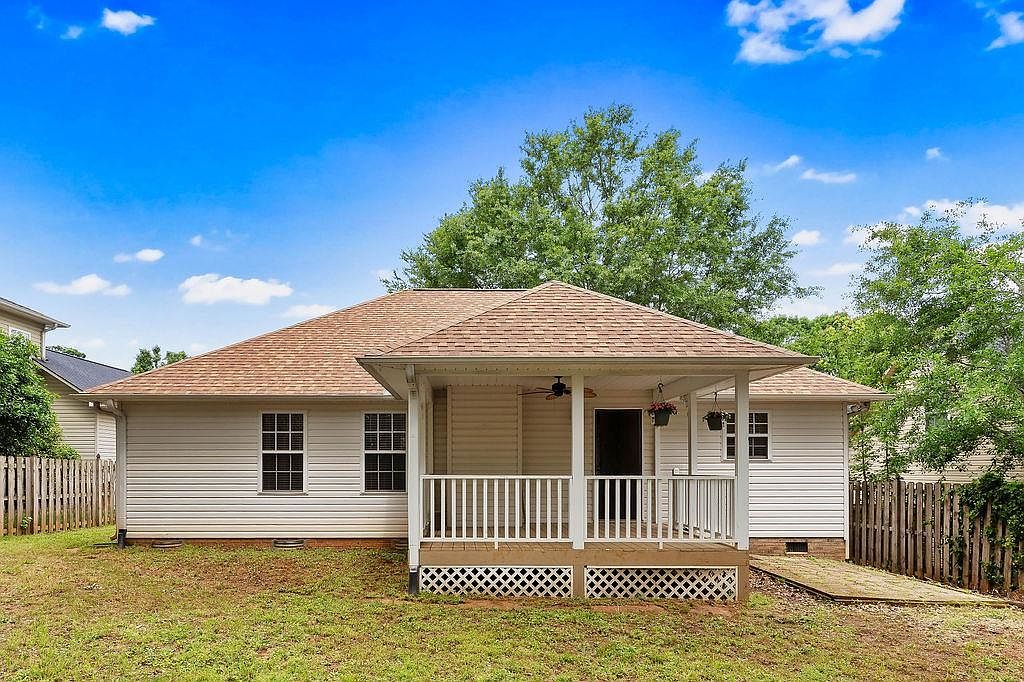 This backyard area features a cozy covered patio attached to the rear of the home, showcasing clean, white siding and a beige shingled roof. The porch has a wooden deck with white railings and decorative latticework beneath, creating a charming and inviting outdoor space. Hanging planters add a touch of greenery, while a ceiling fan ensures comfort during warm days. Multiple windows provide natural light to the interior. The lush green lawn extends around the patio, bordered by a wooden fence and mature trees, offering privacy and a peaceful atmosphere for relaxation or entertaining.