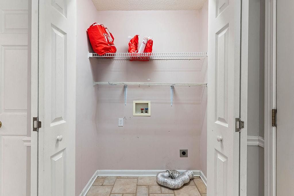 This compact laundry room features a neutral, light beige wall color paired with off-white trim and doors, creating a clean and functional space. The layout centers around a designated washing and drying area, with visible plumbing connections and a dryer vent hose on the tiled floor, suggesting practical use. Two white wire shelves are installed above for storage, holding a few red bags which add a pop of color. The floor is covered with square beige tiles arranged in a subtle pattern, enhancing the room’s durability and ease of cleaning while maintaining a simple yet purposeful aesthetic.