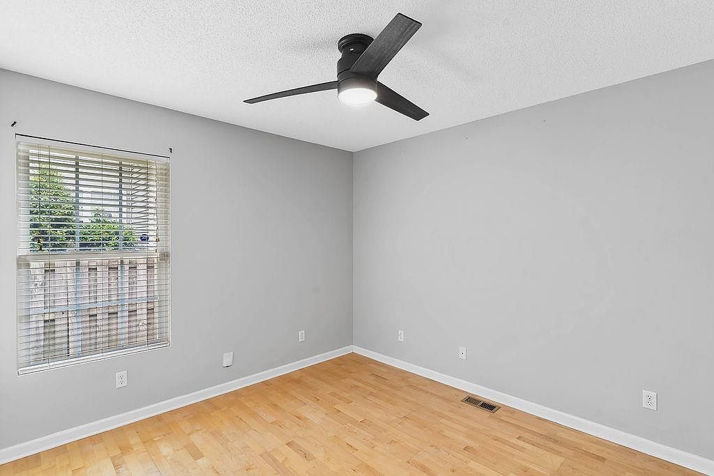 This quiet bedroom corner features smooth light gray walls paired with white baseboards that create a clean, neutral backdrop suitable for various décor styles. The light hardwood flooring adds warmth and contrast, complementing the cool wall tones. A modern black ceiling fan with sleek blades and integrated lighting provides functional airflow and illumination. Natural light filters through white horizontal blinds covering a single window, enhancing the airy feel while offering privacy. Wall outlets and a floor vent are subtly integrated into the space, highlighting thoughtful attention to utility and comfort in this minimalistic yet inviting room.