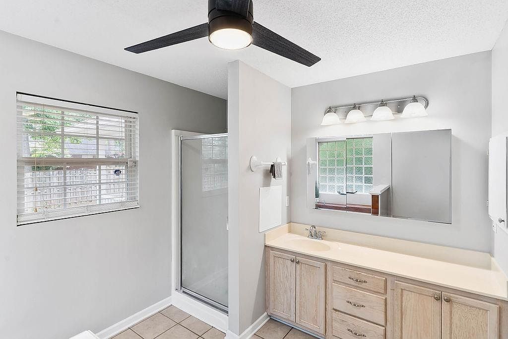 This bathroom features a practical layout with a spacious vanity area on the right side, showcasing light-colored wooden cabinetry topped with a smooth, cream countertop. Above the vanity, a large rectangular mirror is mounted, accented by a four-light brushed metal fixture providing ample illumination. To the left, a glass-enclosed shower stall is partially visible, framed by a half wall that adds privacy and definition to the space. The room is painted with soft neutral tones complemented by beige floor tiles, creating an inviting and clean atmosphere. Natural light flows in through a window fitted with horizontal blinds, enhancing the airy feel.