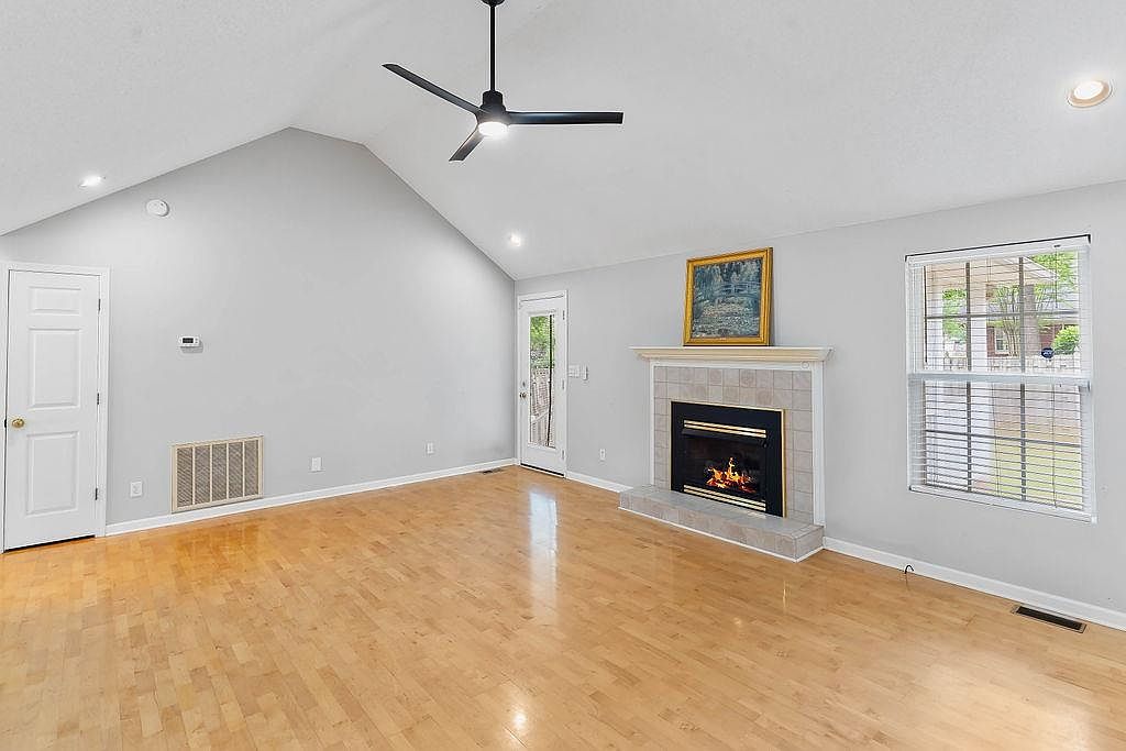 This spacious living room features vaulted ceilings painted in a soft gray tone that pairs elegantly with the light wood flooring, creating a warm and inviting atmosphere. A modern black ceiling fan hangs centrally, balancing the room with subtle contrast. One wall hosts a white-trimmed fireplace with neutral tiles and a framed painting resting above the mantel, adding a touch of classic charm. Natural light pours through a window with white blinds, brightening the space, while a glass door adjacent to the fireplace provides outdoor access, enhancing the room’s airy feel. Minimalist and bright, this living area is both functional and stylish.