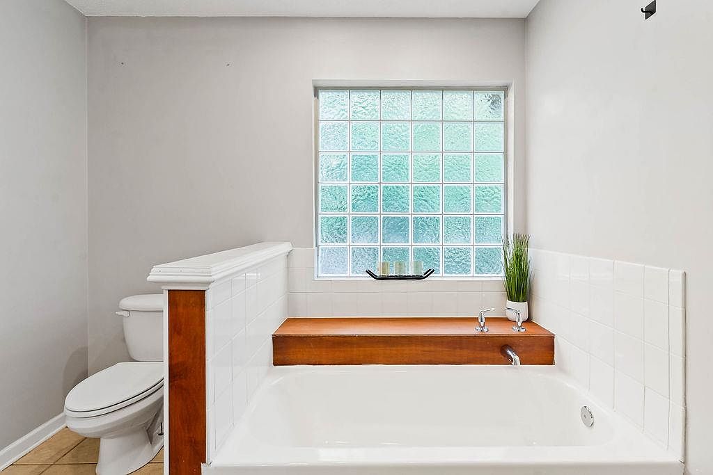 This bathroom features a clean, minimalist design with neutral tones. The bathtub is a deep soaking style, framed by white square tiles that line the walls around it, creating a crisp and fresh look. A wooden ledge atop the tub’s edge adds warmth and contrast, serving as a practical surface for bath essentials. Above the tub, a large glass block window brings in abundant natural light while maintaining privacy with its frosted texture. To the left, a white toilet is partially enclosed by a tiled half-wall, blending functionality with subtle separation. A small plant and minimalist candle holders add a touch of greenery and tranquil accents.
