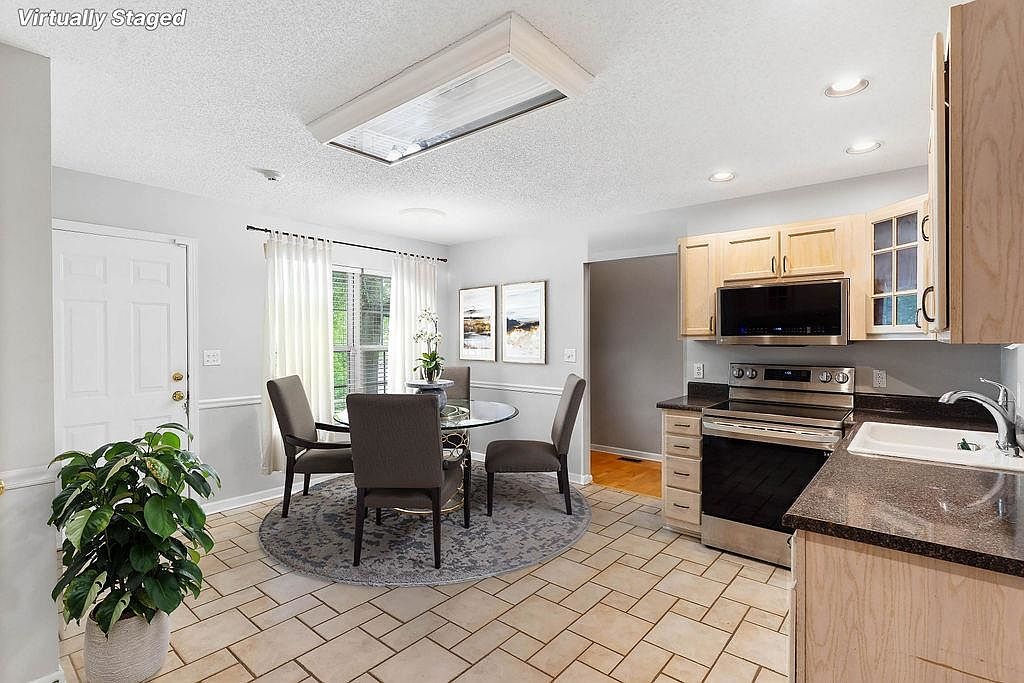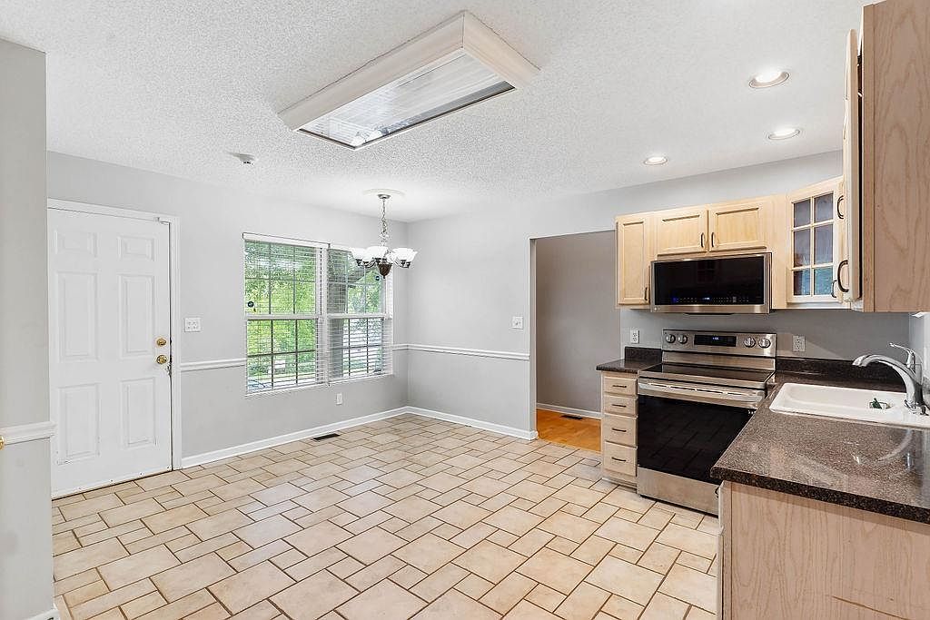 This bright kitchen and adjacent dining space combine functionality and simplicity. Beige tile flooring arranged in a staggered pattern extends throughout, complementing light wood cabinetry with modern black countertops. Stainless steel appliances, including an oven and microwave, add a sleek, contemporary touch. A white sink is set into the countertop, while a window allows natural light to flood the dining area, highlighting the neutral grey walls with white trim and wainscoting. Overhead lighting fixtures include recessed ceiling lights and a classic chandelier above the dining zone. The layout encourages easy movement between cooking and eating spaces.