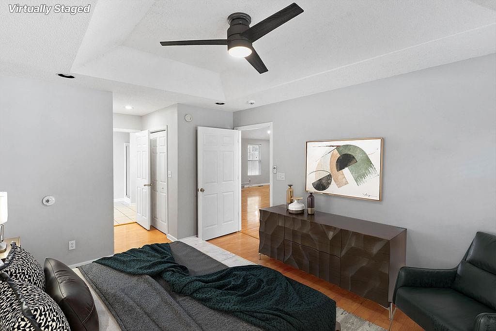 This master bedroom features a serene and modern design with light gray walls and warm wooden flooring, creating a balanced and inviting atmosphere. The focal point includes a dark leather bed frame with patterned pillows and a textured navy throw, enhancing comfort. A sleek, geometric dark brown dresser stands against the wall under an abstract art piece in muted earth tones, adding a contemporary artistic touch. The space is well lit with natural light from an adjacent room and a ceiling fan with integrated lighting provides both function and style. Multiple white doors lead to adjoining rooms and closets, highlighting an open, flowing layout.