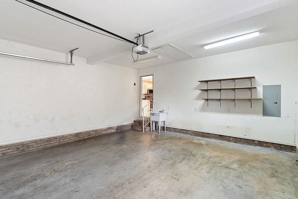 This spacious garage area features a simple, utilitarian design with concrete floors and white painted walls. A set of wooden shelves is mounted on one wall above an electrical panel, offering convenient storage for tools or supplies. The garage door opener is installed on the ceiling, emphasizing functionality. A white utility sink stands near a small set of stairs leading up to an interior doorway that connects to the main house. The space is well-lit with a rectangular fluorescent light fixture, making it practical for both parking and workspace use.