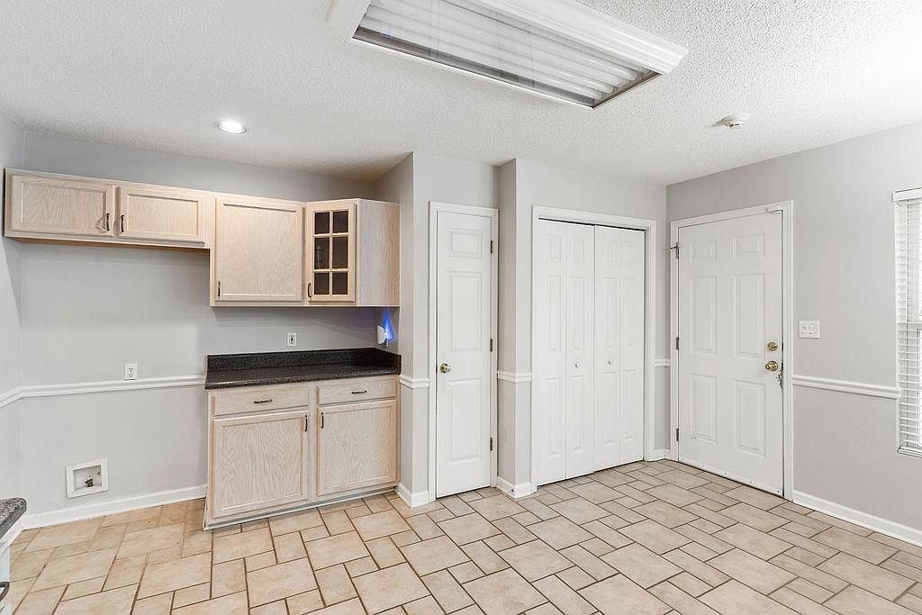 This practical utility area features a clean, neutral palette dominated by light gray walls accented with white trim and doors. The room is anchored by beige tiled flooring arranged in a staggered pattern, creating subtle visual interest. Light wood cabinetry with dark countertops offers functional storage and workspace, with a glass-front upper cabinet adding a touch of elegance. The space includes multiple doors suggesting access to other rooms or storage, while large fluorescent lighting ensures ample illumination. A window with white blinds brings natural light, enhancing the fresh and organized feel of this multi-purpose room.