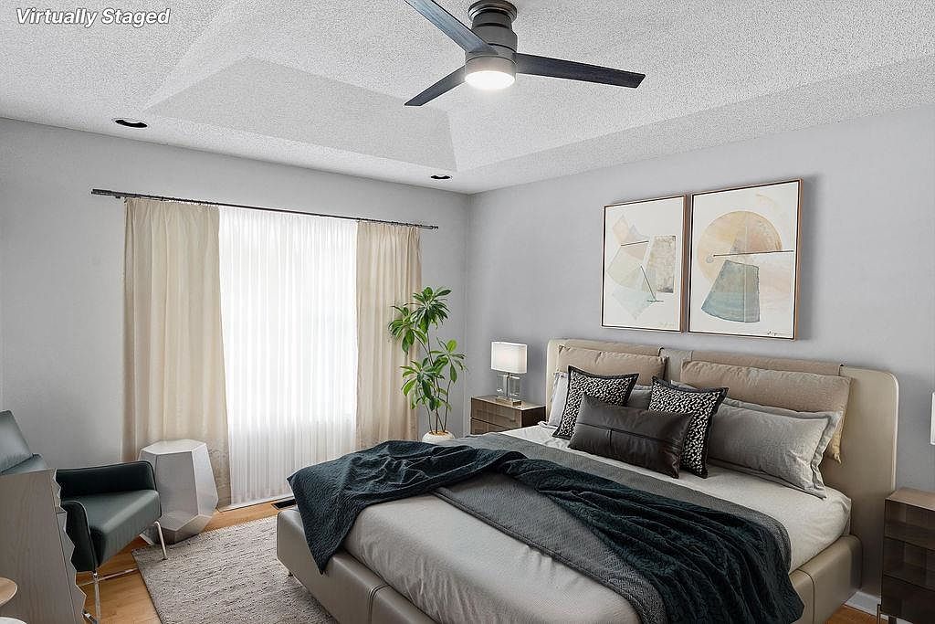 This master bedroom features a calm, soothing palette of soft grays and beige tones, creating a serene retreat. The bed, dressed in neutral linens and layered pillows with black and gray accents, is the room’s centerpiece. Above it, two abstract framed artworks add subtle visual interest. Natural light filters through a combination of sheer white curtains and beige drapes hung on a black rod, brightening the space. A modern ceiling fan with a built-in light complements the minimalist ceiling design. In the corner, an olive-green armchair and geometric side table add extra seating and style, while a lush indoor plant introduces a touch of nature.