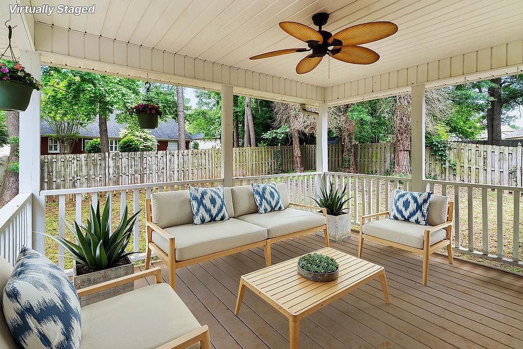This cozy covered porch offers a tranquil outdoor living space with light-toned wooden flooring and white railing. The seating arrangement includes a beige cushioned sofa, matching armchairs, and a complementary wooden coffee table, creating a welcoming spot for relaxation. Blue and white patterned throw pillows add vibrant accents, enhancing the neutral palette with a pop of color. Multiple potted plants add greenery, while hanging flower baskets provide a touch of nature and charm. The ceiling fan with wicker-style blades adds both function and an island-inspired aesthetic to this inviting, airy space overlooking a fenced backyard.
