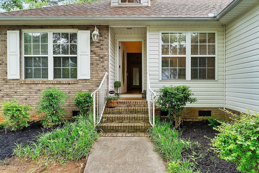 This welcoming front entry features a harmonious blend of traditional brick and modern siding, showcasing a charming contrast in textures. The brick steps with a subtle arch lead up to a recessed doorway framed by white railings, providing a balanced and inviting ascent. Two large windows with white shutters flank the entrance, flooding the interior with natural light and adding symmetry. Lush green shrubs and neat garden beds, bordered by fresh mulch, line the concrete pathway, enhancing the curb appeal. A classic lantern light fixture by the door completes the tasteful, serene exterior aesthetic.