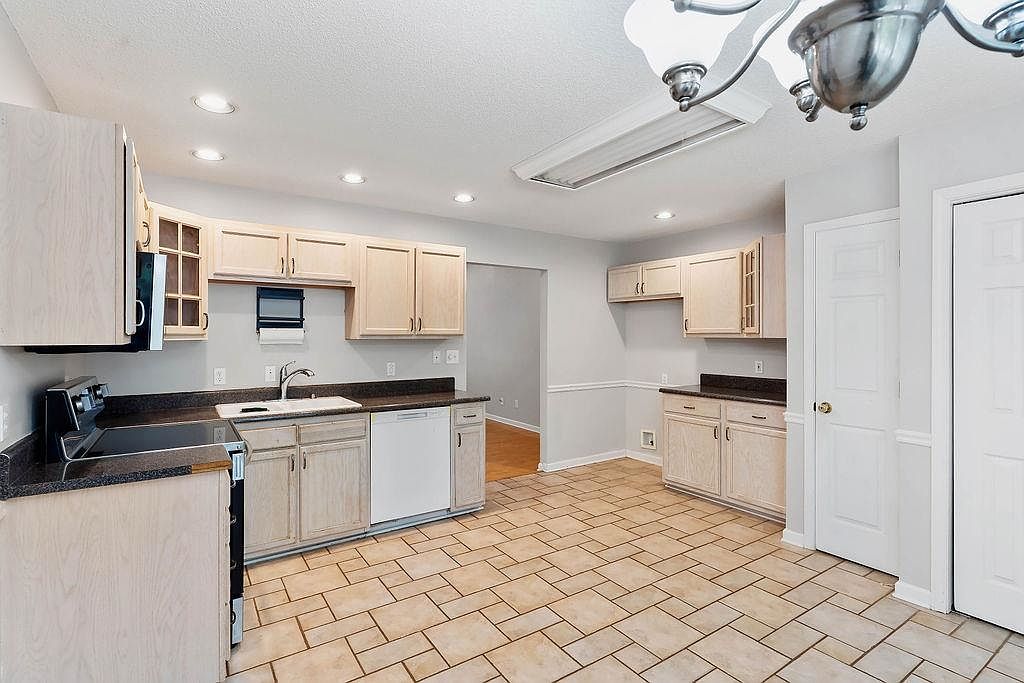 This spacious kitchen features a neutral color palette, with light wood cabinetry contrasted by dark granite countertops, creating a balanced yet inviting look. The floor is covered with beige ceramic tiles set in a staggered pattern, adding texture and warmth. Recessed ceiling lights provide ample, even illumination, complementing the natural light from an unseen source. Stainless steel appliances, including a stove and microwave, contribute a modern touch. The space is organized efficiently with upper and lower cabinets, a dishwasher integrated next to the sink, and an open doorway leading to an adjacent room. A chandelier with multiple small lights hangs towards the right, hinting at a possible dining area nearby. The overall design emphasizes functionality while maintaining an airy, clean, and contemporary aesthetic.
