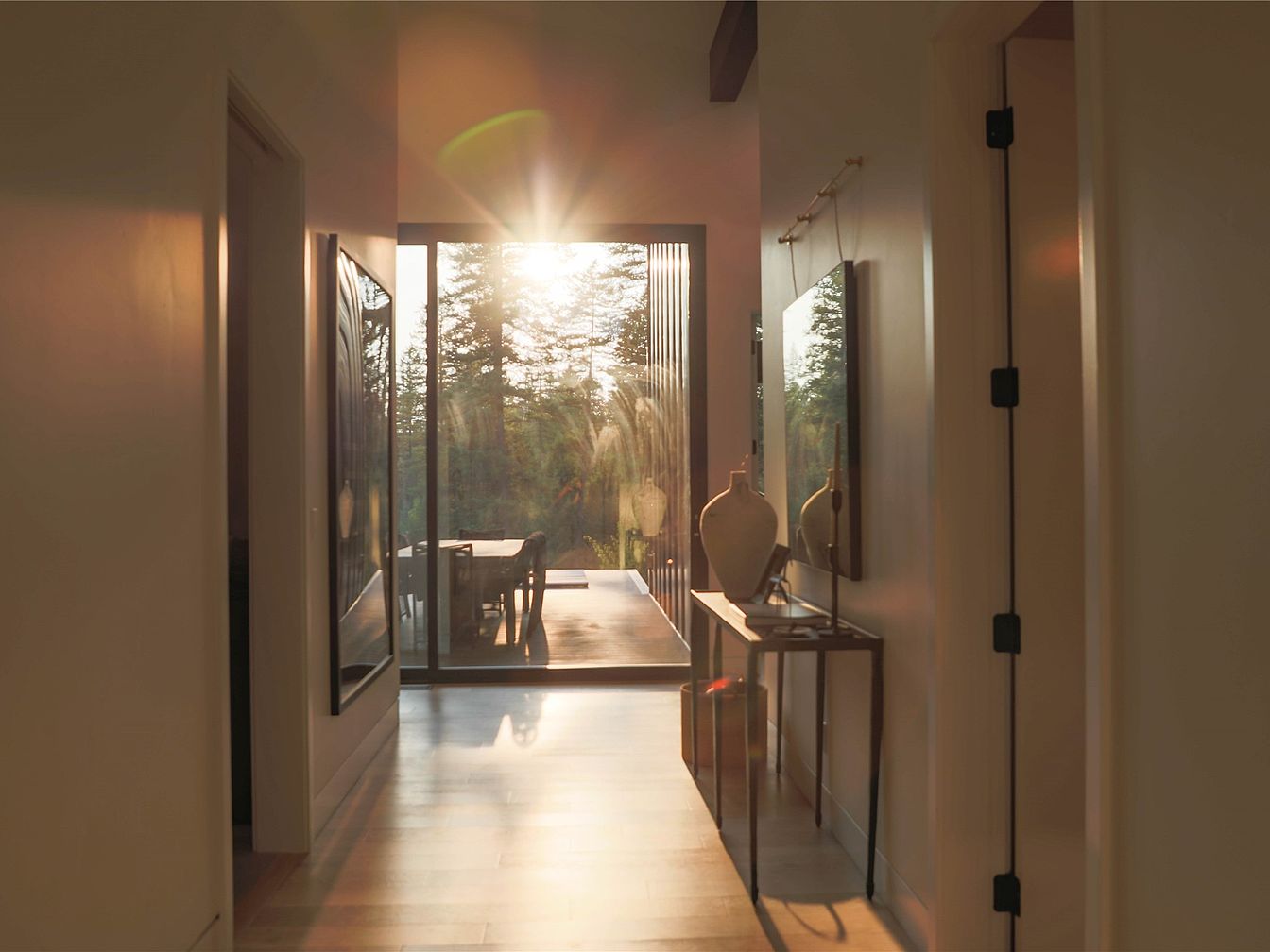 This narrow hallway is bathed in warm natural light from the large floor-to-ceiling sliding glass door at its end, which leads to an outdoor seating area surrounded by trees. The light wood flooring complements the neutral beige walls, creating a warm, inviting atmosphere. On the right side, a sleek console table with a sculptural vase and minimalist decor sits below a hanging mirror, adding depth and elegance. The left side features framed artwork. The simple, clean lines and emphasis on natural light highlight a modern, minimalist design aesthetic connecting indoor and outdoor spaces harmoniously.
