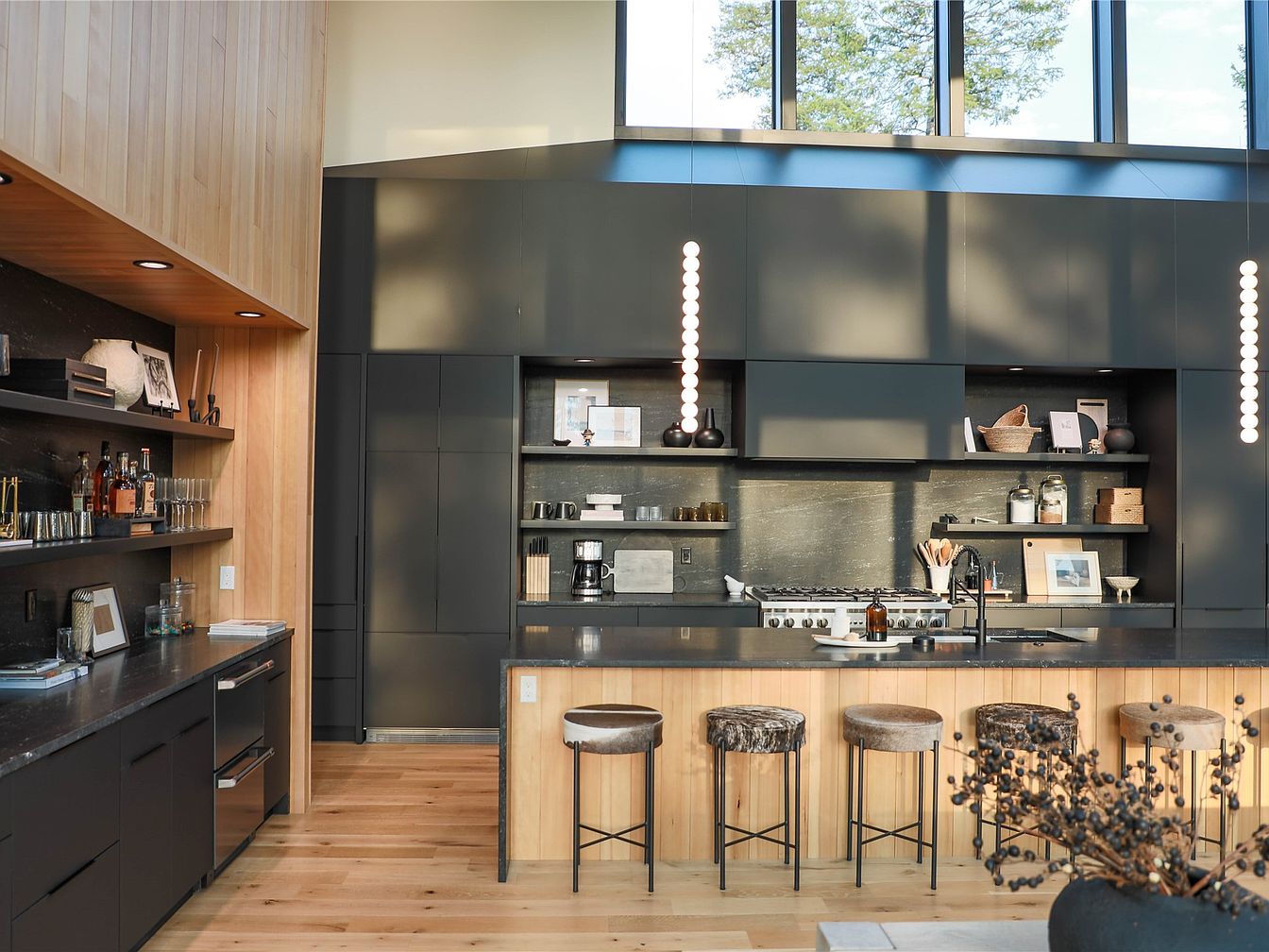 This kitchen features a sleek and contemporary design, centered on a large island with a light wood base and dark countertop that offers ample seating with five varied stools. The back wall showcases matte black cabinetry and open shelving, providing storage along with space to display ceramics, glassware, and decorative items. A stainless steel stove is built in with a streamlined hood above. Light wood floors and vertical wood paneling add warmth, contrasting with the dark surfaces. Tall windows flood the space with natural light. Vertical pendant lights with round bulbs add a modern architectural touch.
