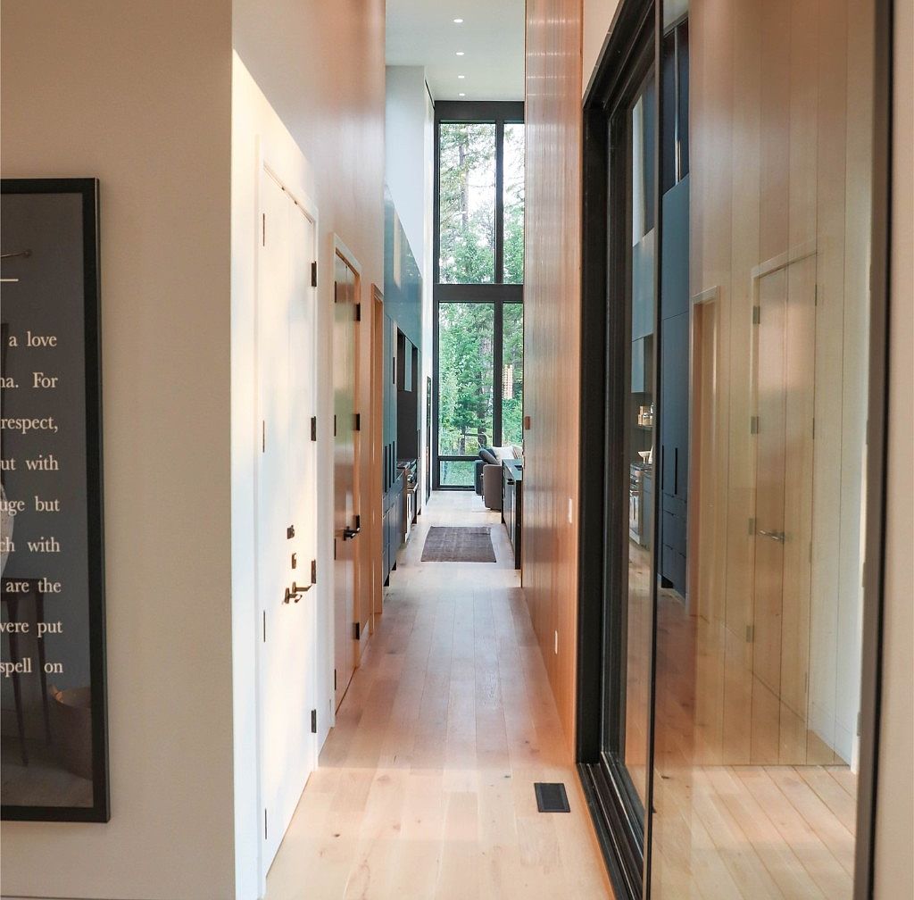 This hallway features a sleek, modern design with a combination of natural light and warm toned wood paneling on the right wall, contrasting the white painted doors along the left side. The light hardwood flooring adds to the airy feel while continuing seamlessly into the adjoining living space visible at the end of the corridor. Floor-to-ceiling windows at the far end flood the space with natural light and offer a scenic view of lush greenery outside. The minimalist aesthetic focuses on clean lines, neutral colors, and a balanced blend of wood and glass elements, enhancing the home’s contemporary vibe.