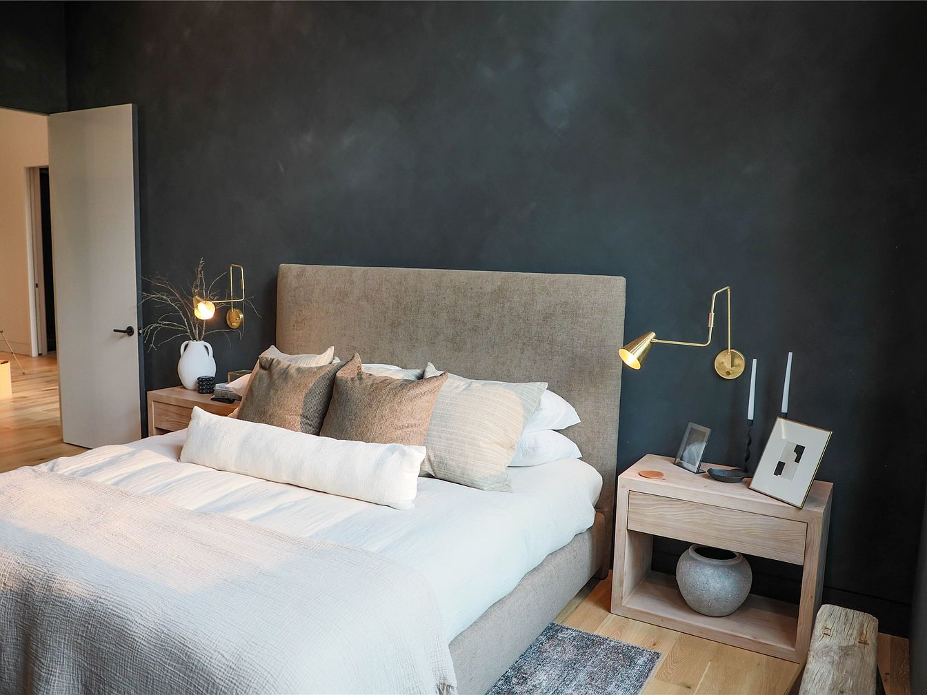 This bedroom exudes a modern rustic charm with its dark slate-gray walls creating a cozy, intimate atmosphere. The centerpiece is a spacious bed with a tall, upholstered beige headboard framed by an array of neutral-toned pillows and crisp white bedding that softens the room’s moody backdrop. On either side, minimalist light wood nightstands hold subtle personal touches, including art pieces, sculptural candlesticks, and a matte ceramic vase, while brass swing-arm sconces add warm, directed lighting. The natural wood flooring and textured rug complement the earth tones, enhancing the inviting and serene vibe.