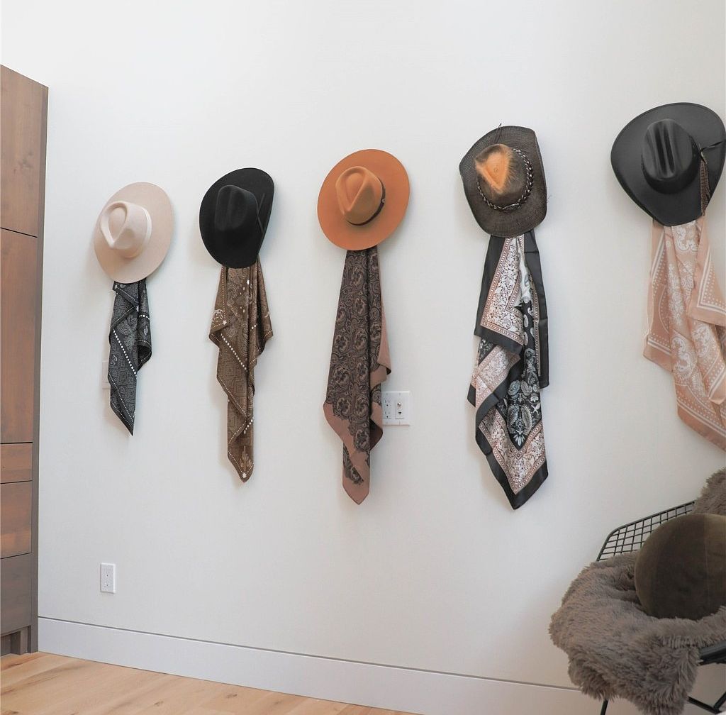 This entryway corner features a minimalist design with a series of five hats and matching bandanas neatly hung on the wall, creating a rustic and welcoming vibe. The wall is painted white, enhancing the clean and airy feel. Each hat is different in color and style, ranging from beige to black and a warm terracotta, paired with earthy-toned scarves that add texture and pattern to the space. The light wood floor complements the neutral palette. A cozy chair with a furry seat cushion and brown pillows sits nearby, inviting relaxation while adding warmth and softness to the otherwise simple setup.