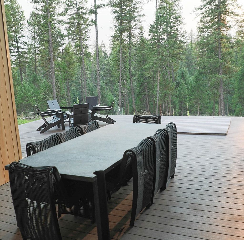This spacious outdoor deck features a modern, minimalist dining setup with a sleek rectangular table surrounded by six black woven chairs, creating a stylish yet relaxed atmosphere. The deck is constructed from wide wooden planks in a natural muted tone, harmonizing perfectly with the lush green forest backdrop. Beyond the dining area, additional seating with simple black Adirondack chairs provides a casual lounging space. The setting accentuates a seamless indoor-outdoor flow, offering a serene environment for meals or gatherings amid tall pine trees, emphasizing nature-inspired tranquility and contemporary design.