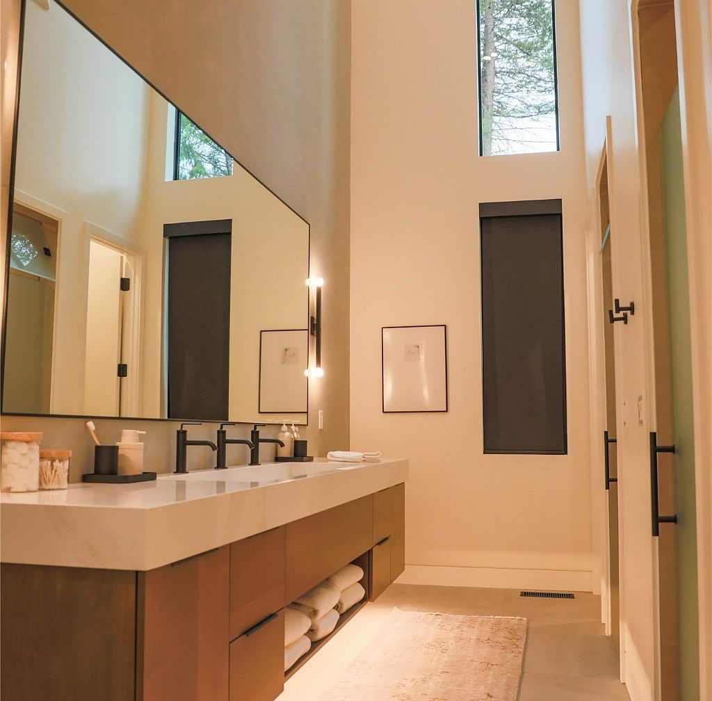 This bathroom features a sleek and contemporary design centered around a long floating vanity with a white quartz countertop and integrated double sinks. The cabinetry is a warm wood tone, adding softness to the otherwise minimalist space. Beneath the countertop, open shelves hold neatly folded white towels, contributing to an organized and spa-like atmosphere. A large frameless mirror spans the wall above the sinks, enhancing natural light reflected from two tall vertical windows with dark shades, and complemented by simple black fixtures and vertical sconce lighting. The neutral beige walls and floor create a calm, inviting environment.