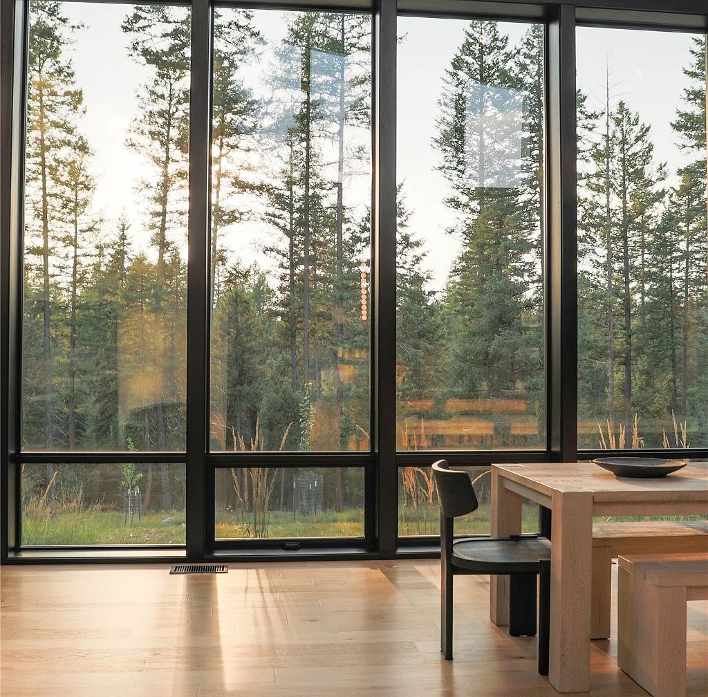 This dining space features expansive floor-to-ceiling windows that flood the room with natural light and offer unobstructed views of a serene forest. The light hardwood floor seamlessly complements the simplicity of the sturdy, rectangular wooden dining table paired with dark, modern chairs, creating a subtle contrast. The black window frames add a sleek, contemporary touch while framing the lush greenery outside, establishing a calm connection between indoors and nature. The minimalist aesthetic relies on clean lines and natural materials, emphasizing tranquility and an open, airy atmosphere.