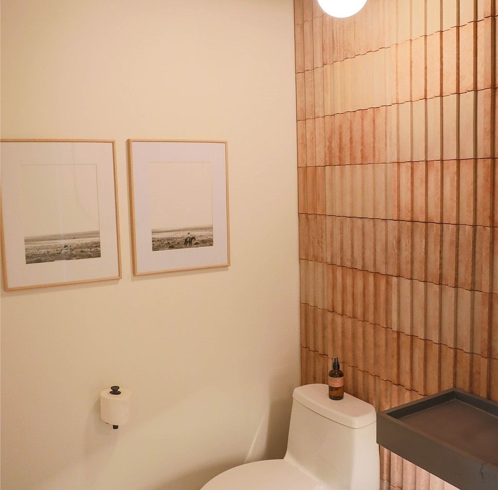 This compact powder room features a modern, clean design with soft neutral tones. The right wall is adorned with vertically grooved terracotta tiles in varying warm shades, adding texture and a natural element to the space. A sleek white toilet sits against this accent wall with a bottle of hand soap placed on top, combining practicality with understated elegance. The left wall is painted a soft cream color and is decorated with two simple framed black-and-white photographs, which lend a minimalist yet personal touch. A discreet toilet paper holder blends seamlessly into the room’s calm aesthetic.