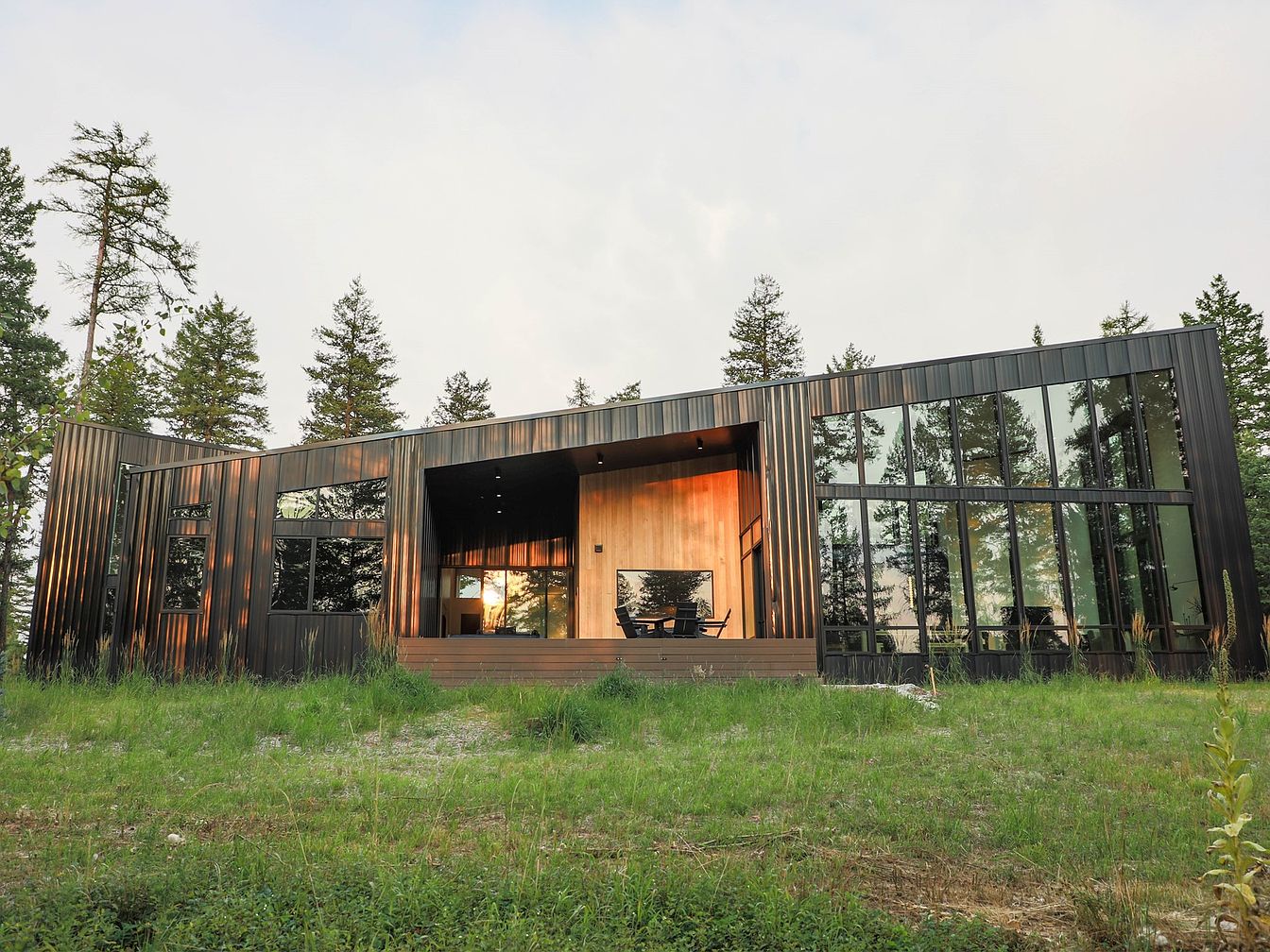 Shadowbox is a striking example of modern architectural style, characterized by its bold black angular exterior clad in textured ridges inspired by natural topography. Located in the serene surroundings of Whitefish, Montana, this home harmonizes with the surrounding forest, reflecting a deep connection to nature. While the exact year of construction is not mentioned, the home appears newly built or recently constructed, showcasing contemporary design and craftsmanship by Wood Roots Construction. The interior exudes warmth and luxury with oak flooring and tongue-and-groove hemlock wall panels under soaring 25-foot ceilings in the great room. This residence features four spacious bedrooms and three bathrooms, comfortably accommodating family and guests. The design emphasizes indoor-outdoor living with large windows offering panoramic forest views and expansive openings leading to a covered patio equipped with a sauna, fire pit, and sunken hot tub for relaxation under the Montana sky. The listing price for this exceptional retreat is $3,500,000. The home serves as a peaceful retreat inviting relaxation, reflection, and adventure, with design and interiors thoughtfully curated by Cavin Costello of The Ranch Mine and The Life Styled Co.