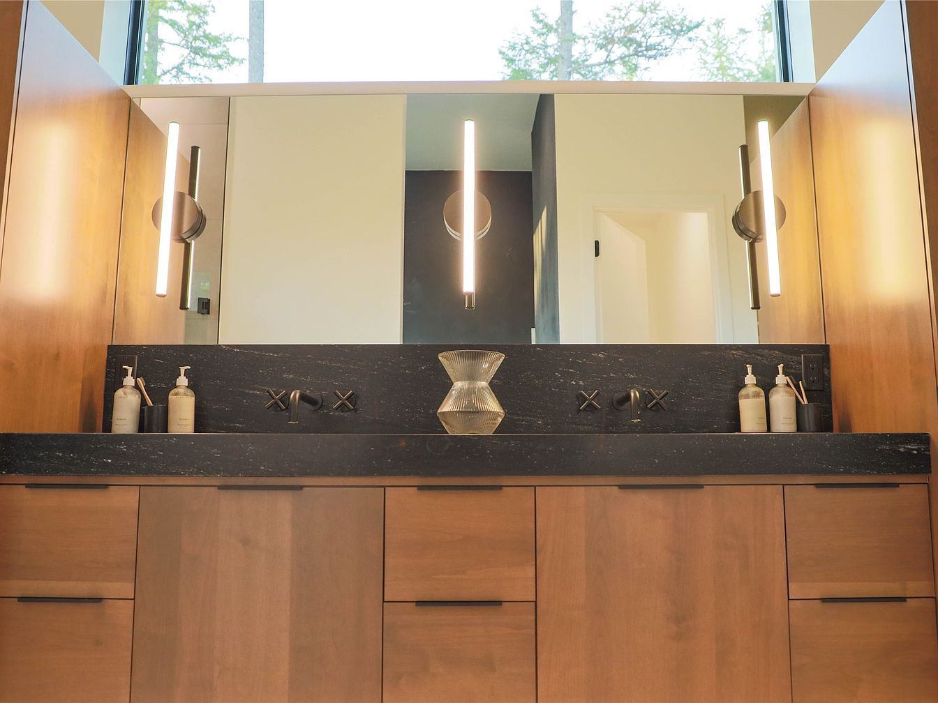 This bathroom vanity area features a modern, dual-sink setup built into a substantial black stone countertop that contrasts beautifully with the natural wood cabinetry below. The cabinetry has a clean, flat-panel design with sleek black handles, emphasizing simplicity and function. A large, expansive mirror runs horizontally behind the sinks, framed by wood paneling that matches the cabinets, creating a cohesive and warm aesthetic. Vertical, tubular wall lights on either side of the mirror cast soft, balanced illumination. Minimalist black faucets and neatly arranged soap dispensers add functional elegance, while a textured glass vase adds a subtle decorative touch.