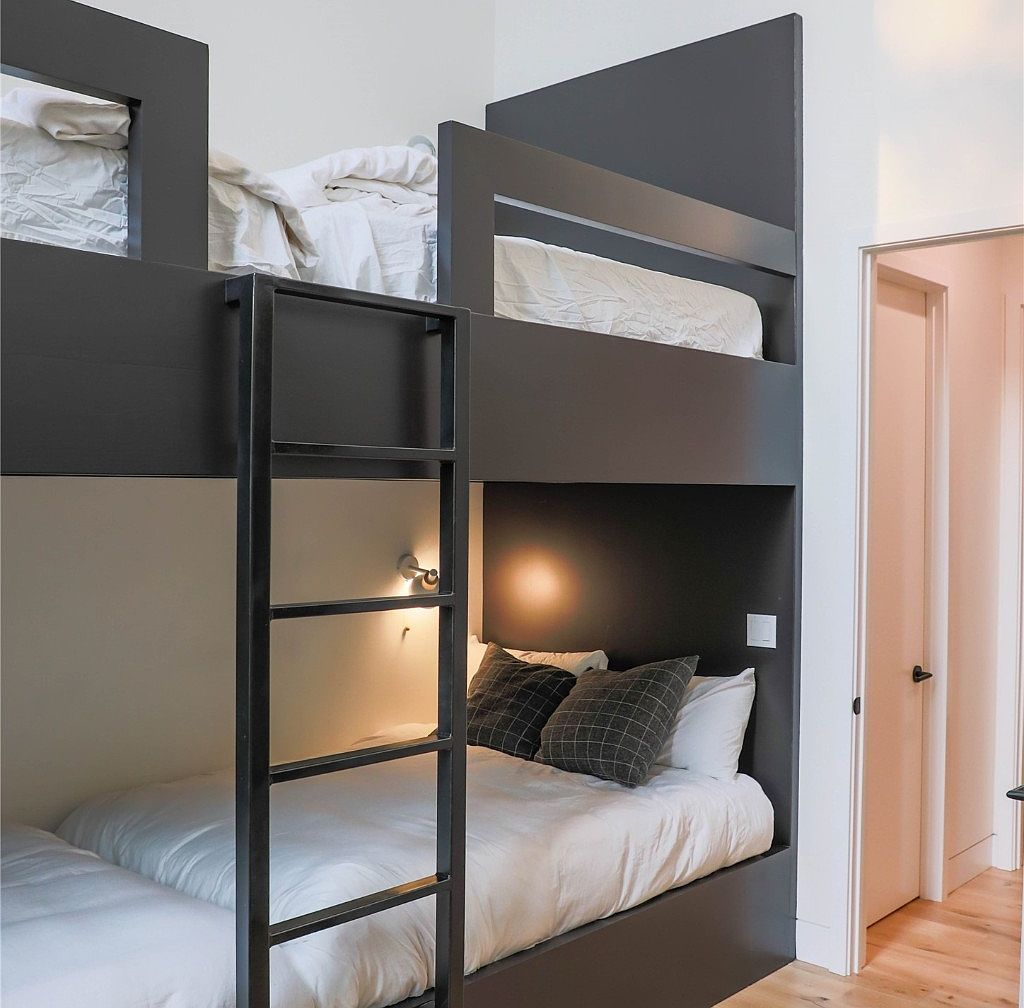 This compact sleeping area features sleek, black built-in bunk beds with a minimalist ladder, designed to optimize space while maintaining a modern aesthetic. The lower bunk is accented with cozy, dark plaid pillows contrasting against crisp white bedding, adding a touch of warmth. A small, wall-mounted reading light glows softly above the bottom bed, creating an inviting ambiance. The clean lines of the bed surround blend effortlessly into the neutral, light-colored walls and wide plank wooden flooring, which adds natural texture and warmth to the overall clean, contemporary design.