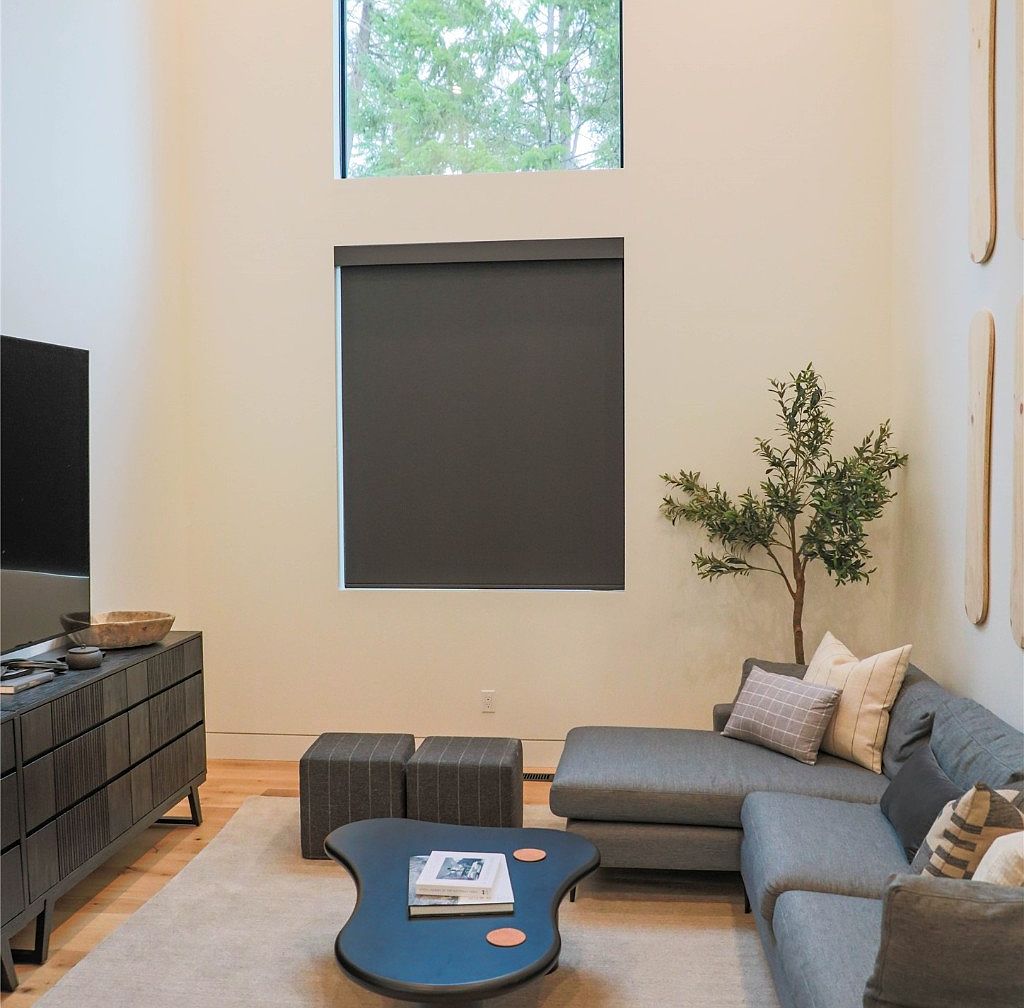 This living room showcases a modern and minimalist aesthetic with a muted color palette dominated by shades of gray and natural wood tones. The sectional sofa, upholstered in soft gray fabric, is accented with a variety of patterned and solid pillows that add subtle texture and comfort. A creatively shaped black coffee table with curved edges stands atop a light beige area rug, complementing the light wood floor. Two matching gray ottomans contribute additional seating or lounge space. A tall, narrow window with a black blind invites natural light while maintaining privacy. A faux leafy plant in the corner adds a refreshing touch of greenery, balancing the clean, contemporary vibe. Overall, this space exudes calm and understated elegance, perfect for relaxation.