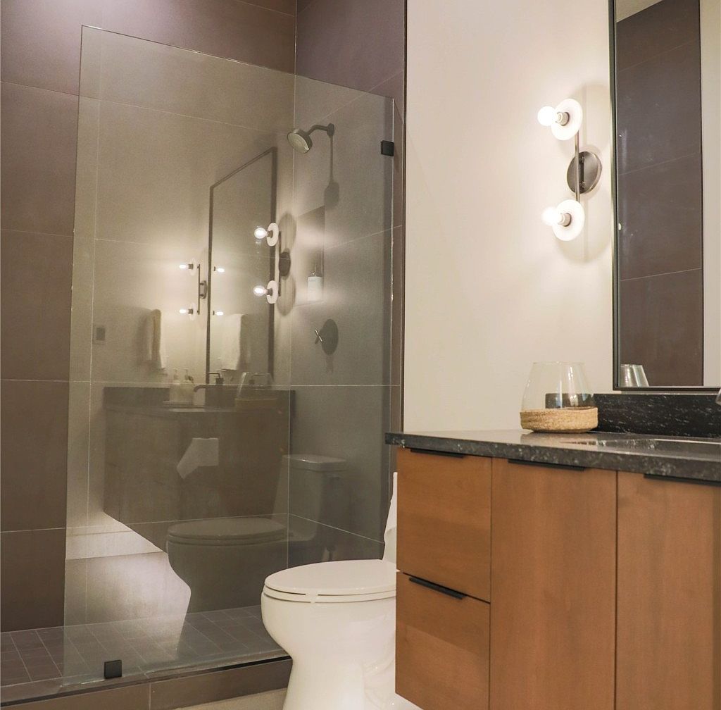 This bathroom features a sleek and minimalist design with neutral tones. A frameless glass shower enclosure highlights the space, emphasizing openness and clarity. Inside the shower, large grey tiles create a modern backdrop, paired with a chrome showerhead and fixtures. Adjacent to the shower, a white toilet balances the muted palette. The vanity boasts warm wood cabinetry with clean lines and matte black handles, topped by a dark stone countertop adding texture and depth. A large mirror above the vanity is framed by contemporary light fixtures with exposed bulbs, enhancing the soft, warm ambiance.