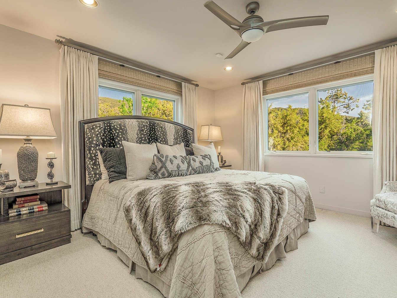 This serene bedroom features a spacious layout centered around a large bed adorned with a textured beige quilt and a soft, plush faux fur throw in neutral tones. The headboard stands out with an eye-catching pattern in dark, natural colors, complementing the array of decorative pillows layered comfortably. Soft cream-colored walls harmonize with the matching carpet, creating a warm and inviting atmosphere. Two bedside tables with elegant lamps flank the bed, providing balanced lighting. Large windows on two walls are dressed with woven blinds and flowing, light curtains, inviting abundant natural light and scenic views of lush greenery outside. A minimalist ceiling fan adds a modern touch while maintaining functionality, completing the room’s tranquil and stylish ambiance.